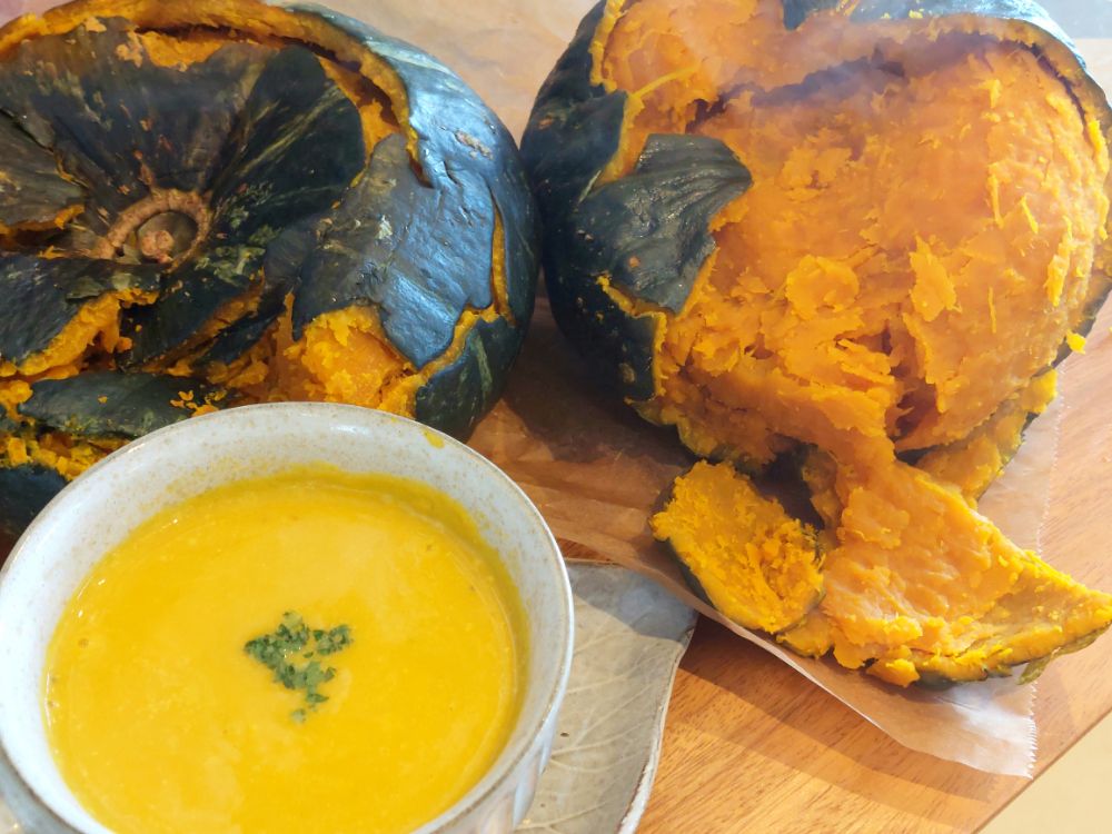 今月ご提供のスープは、オニオングラタンスープに加えて、カボチャのクリーミーポタージュです。 ペースト…