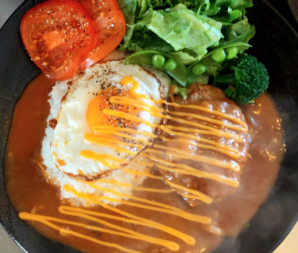 こちらのハンバーグは「ロコモコ丼」と今時期だけのおまかそ料理「ごろごろハンバーグのチーズトマトソース煮込み」でご提供しております。
