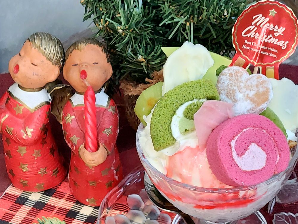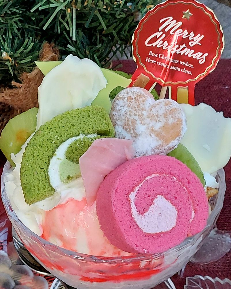 クリスマスらしくストロベリー&バニラアイスに、赤(イチゴ)と緑(抹茶)のロールケーキを添え、クッキーとフルーツを乗せました。