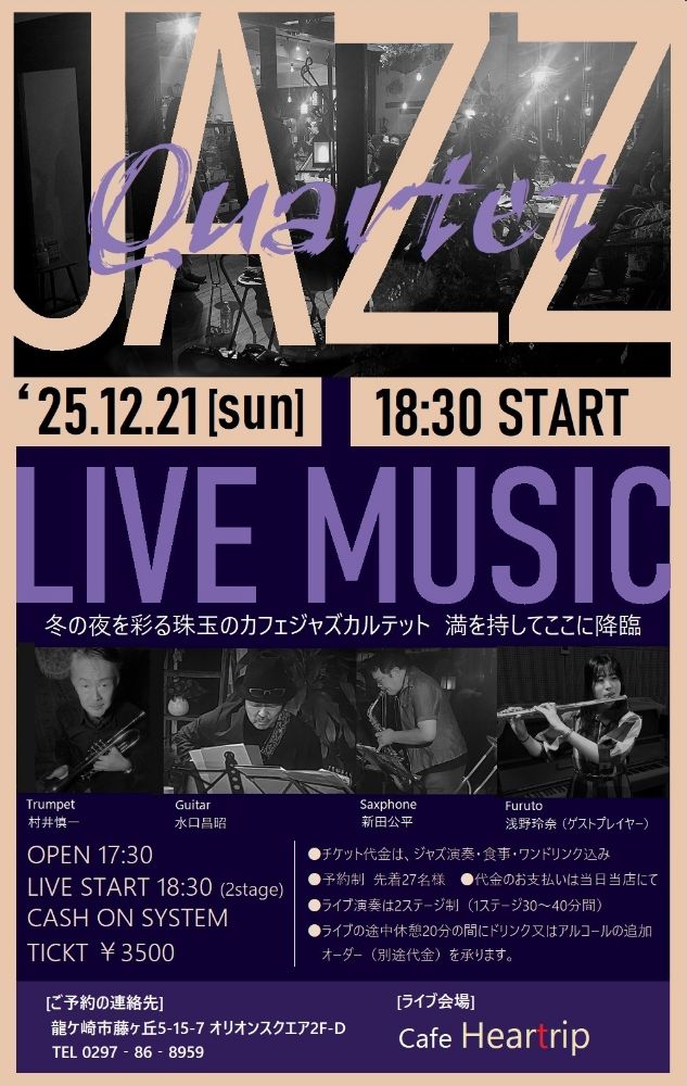 今年もプロジャズマンによるカルテットのジャズライブを当店(ハートリップ)にて開催いたします。