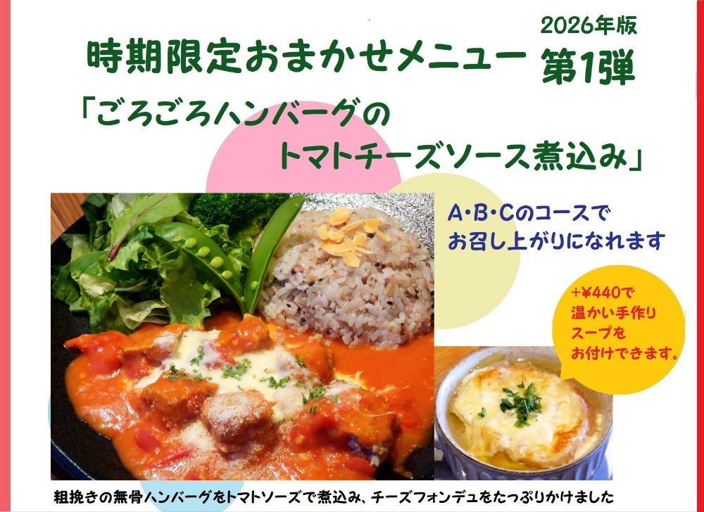 時期限定おまかせメニュー26年第1弾「ごろごろハンバーグのトマトチーズソース煮込み」ご提供予定