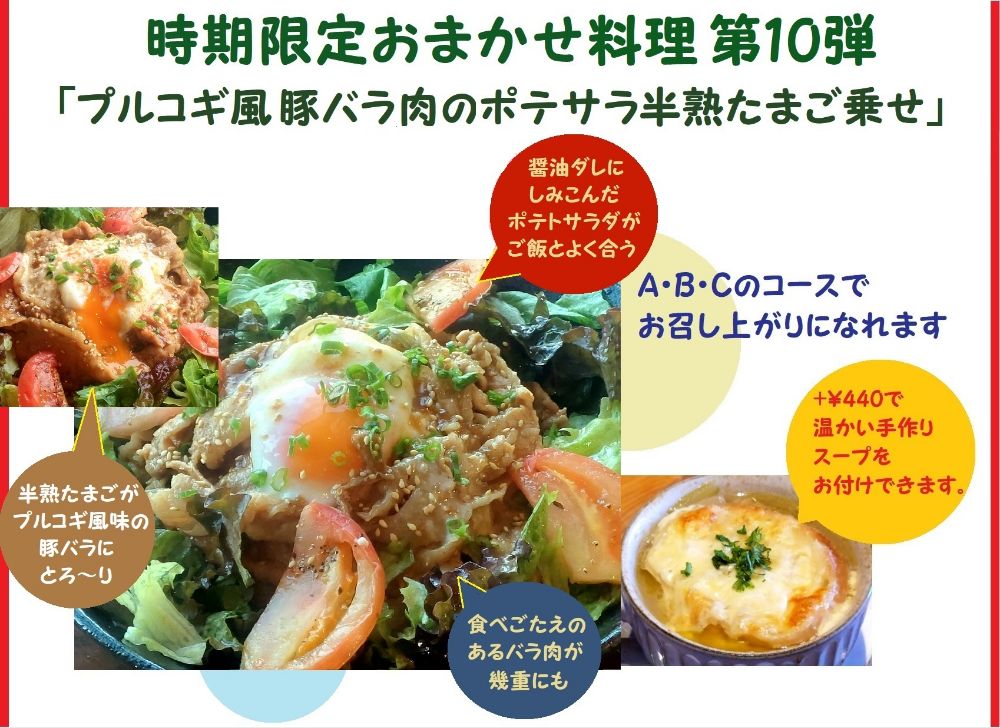 そして昨年から続いている、おまかせ料理第10弾「プルコギ風豚肉のポテサラ半熟たまご乗せ」も好調につきご提供継続いたします。
